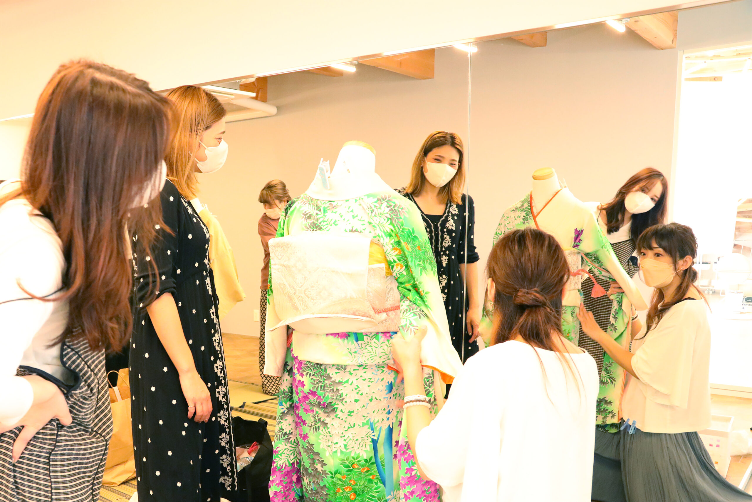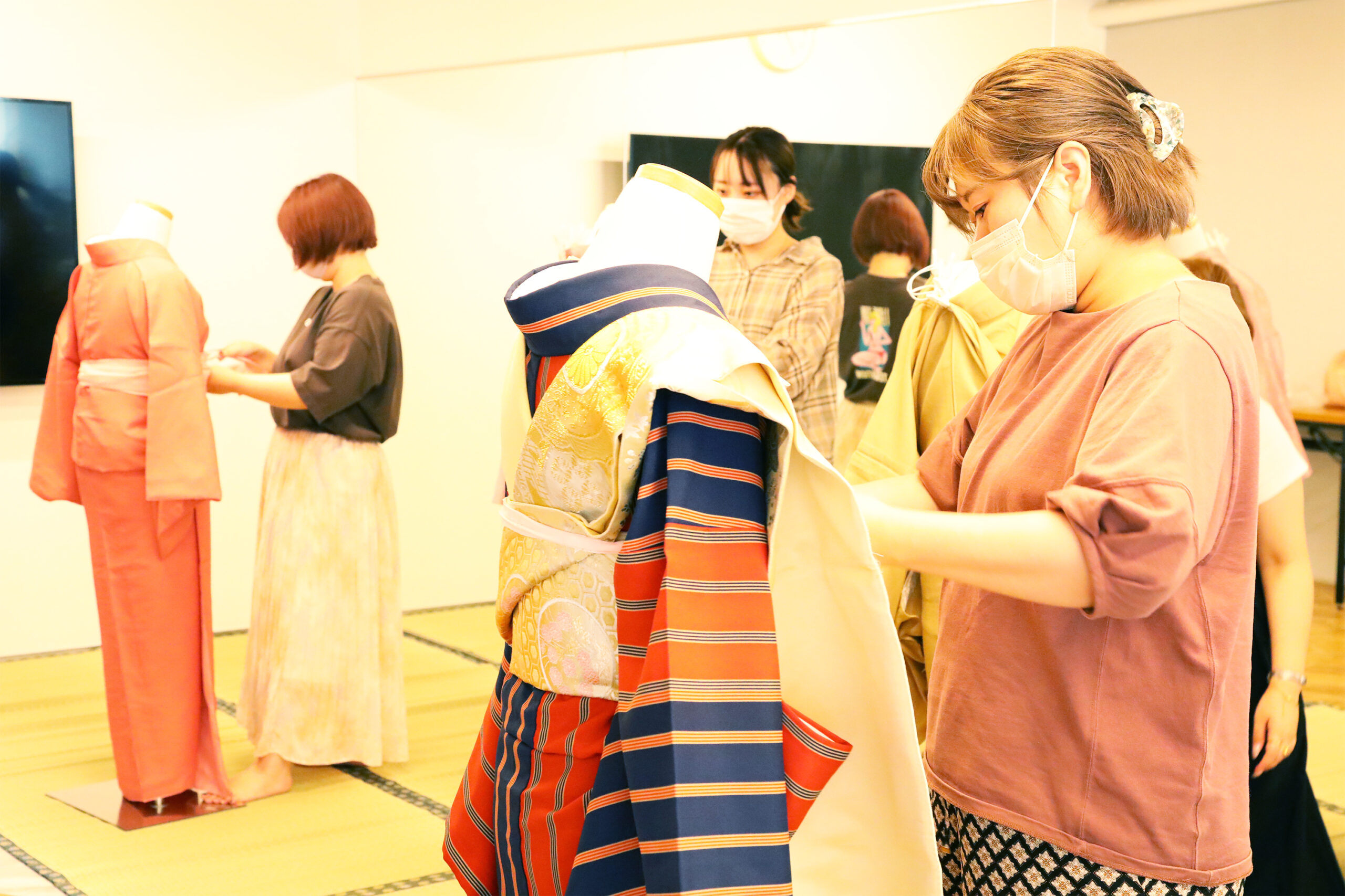 Ifhには着物事業部があり、定期的に練習会を行っています。参加者はヘアーだけでなくネイル、レセプションなど他部署から希望者が集まります。全てはお客さまの笑顔のため。大切なハレの日のお手伝いをするために着付けに必要なものや基礎知識をゼロから学ぶことができます!